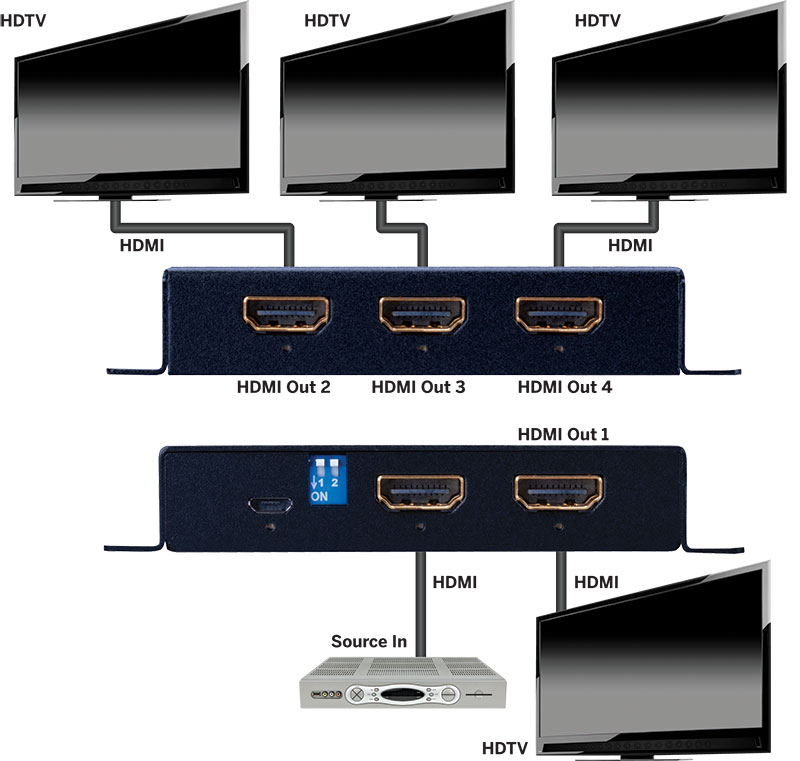 Transmits audio and video from a single source to 4 displays up to 4K (2160p) Ultra High Definition resolution without any loss of quality or resolution